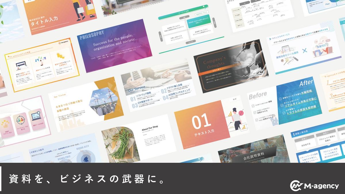 「資料作成代行サービス(株式会社M-agency)」では、1Pあたり9,200円~(通常価格)で、プロによる洗練されたデザインや、資料解析ツールで取得した閲覧行動データをもとに最適化された資料構成の提案が可能です。